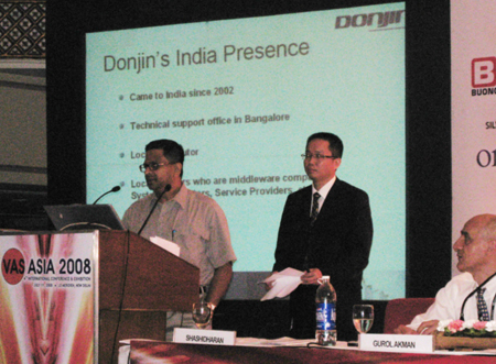 Donjin, acting as the major sponsors of VAS Asia 2008, is the main player in this expo. During the expo, Donjin introduced to the participants its development history, product technical advantages as well as its applications in China telecom industry and received wide recognition from the participants. Meanwhile, its voice board product displayed on its stand attracted many India local operators and integrators. The powerful technology and performance integrated in Donjin products were highly appraised by the visitors.