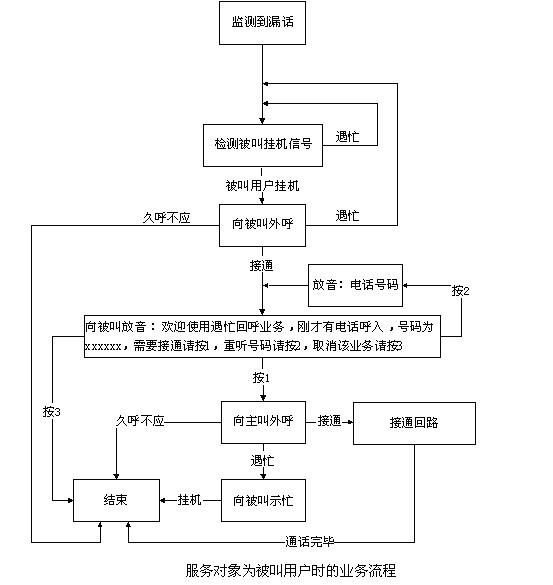 当服务对象是被叫用户时,产生遇忙漏话后,东进漏话监测设备(DMCS)实时检测被叫用户的挂机信号,如果被叫挂机,则先向被叫外呼,呼出接通后,语音提示“欢迎使用遇忙回呼业务,刚才有电话呼入,号码为xxxxxx,需要接通请按1,重听号码请按2,取消该业务请按3”,如按1,系统向原主叫外呼(亦称回呼),回呼成功(ACM)后,建立话音回路,进一步接续;如回呼原主叫时遇忙(SLB、STB等),则回呼失败,向被叫用户示忙。