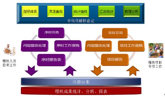 针对稽核工作中稽核工作盲点多、风险排查范围不全面,工作流程不规范,问题不能及时上报、存在信息截留情况,无有效的查证手段,稽核成果难以有效积累,管理部门无有效手段管理各级稽核工作,现场稽核和非现场稽核无法共享资源等各种弊端以开发稽核系统。