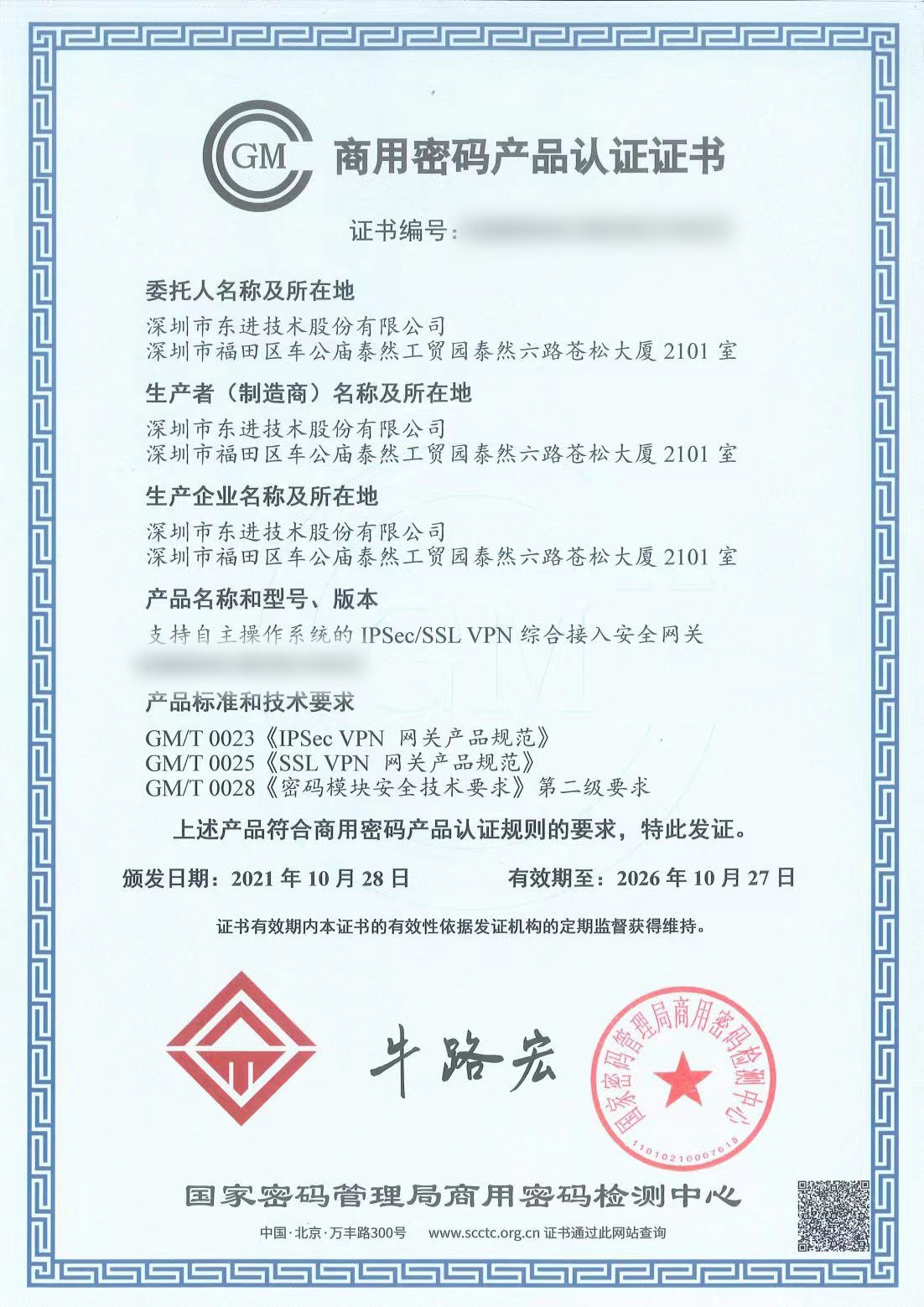 东进信创IPSec/SSL VPN综合接入安全网关获商用密码产品认证证书2021/12/15