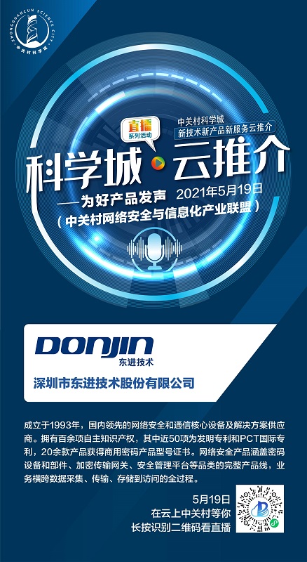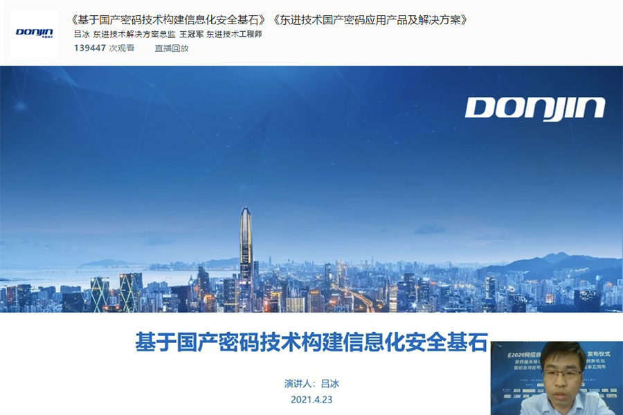 ?5月19日,中关村科学城云推介·网络安全专场活动如约上线,包括东进技术在内的多家优秀网络安全企业入选此次云推介活动,来自各企事业单位、行业联盟、产业园区等各方观众线上实时观看,东进技术解决方案总监吕冰亮相直播间,带来了《信息系统国密方案》的主题分享。