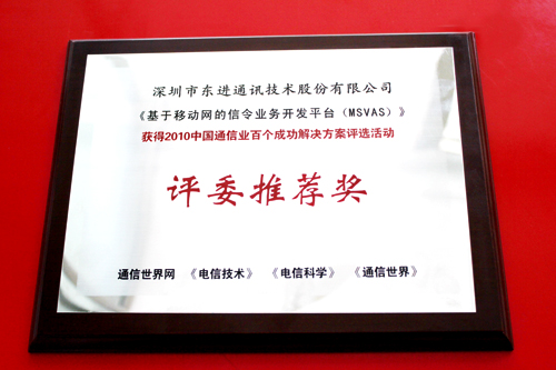 从2010年7月起评选进入征集阶段,经过长达3个月的层层筛选,最终百个成功解决方案出炉,并由多家主流媒体公示。东进技术“基于移动网的信令业务开发平台(MSVAS)”解决方案凭借出众的实用经济性、安全可靠性、灵活性和成熟性,经过两个月网络初选,和近百位运营商层面专业人士组成的组委会技术终选后获此殊荣。