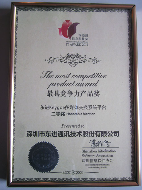 本届论坛由深圳市人民政府主办,深圳信息软件协会承办组织。“最具竞争力产品奖”,专设给自主研发,功能完善,服务优质,并具有相当市场销售量的产品。东进技术申报并获奖的,是自主研发的东进Keygoe多媒体交换系统平台。