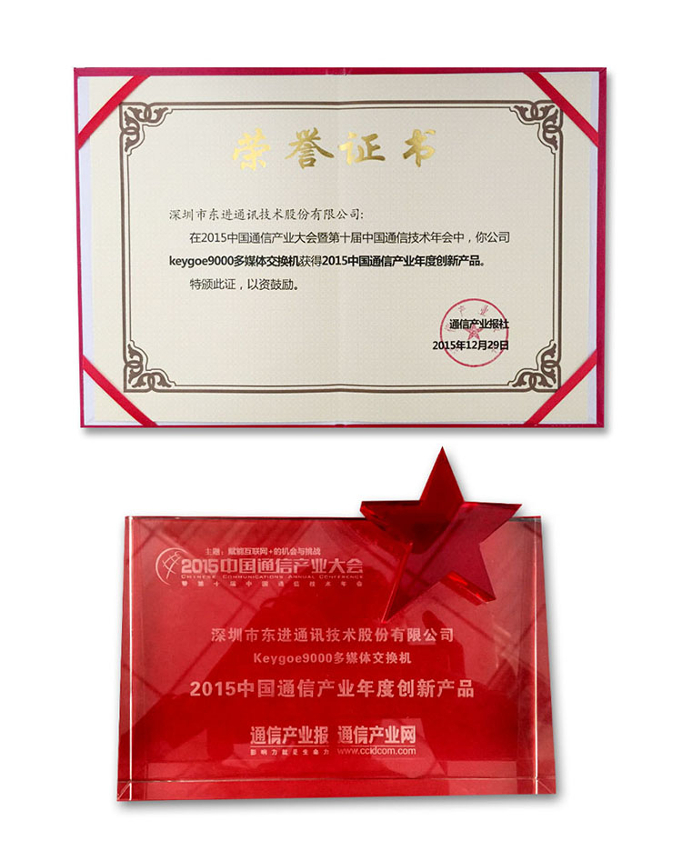 (图:东进keygoe9000多媒体交换机获得“2015中国通信产业年度创新产品”奖)