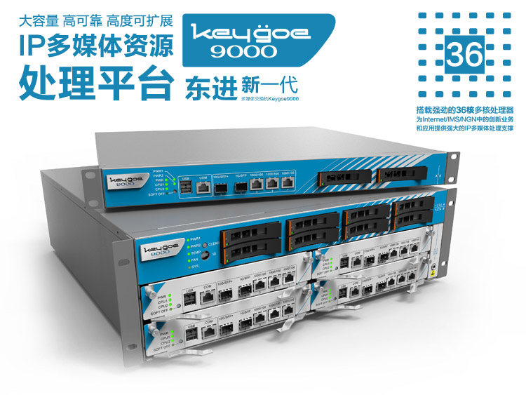 作为新一代多媒体交换机,东进Keygoe9000系列多媒体交换机是专门应用于IP网络环境中的大容量、高可靠和高度可扩展的IP多媒体资源处理平台,通过在内部构建一个高带宽的全IP交换网络,将多媒体处理、流程控制、媒体控制、信令控制以及配置管理等模块分布式地部署在该网络中,从而构成一个全IP化的多媒体资源处理平台。
