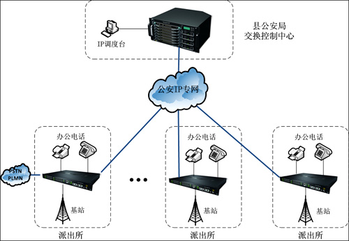 延伸到其他应用区域中,此套系统的实现形式还能够根据当地实际情况进行演变。除了县级平台和派出所基站可统一使用交换机系统搭建外,也能够在已有中转台设备的派出所安装VoIP网关设备,升级中转台为基站,与县级基站联网组成无线通信网络;另外还可以在派出所安装无线基站和VoIP网关设备, VoIP网关则依托公安IP网与县级交换控制中心互联。应该说充分满足了各地不同情况的系统搭建需求。